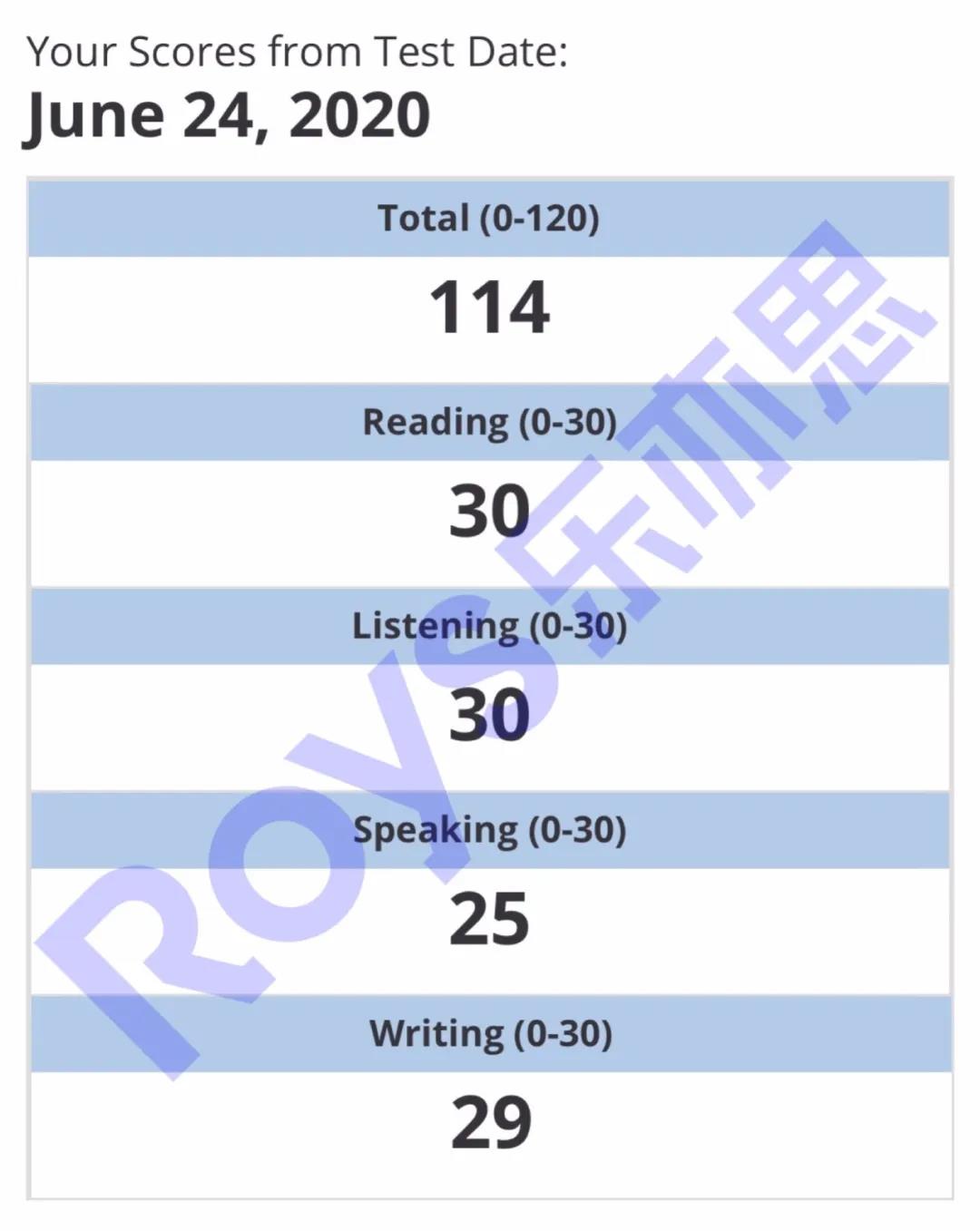 Roys樂亦思托福課程學員培訓6天進步4分,獲114高分