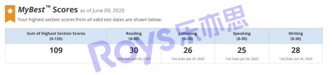 王同學(xué)在參加融合班課和一對一課程集訓(xùn)后, 參加6月5日線上托福考試, 獲得了總分109的好成績, 閱讀滿分, 口語順利拿下25分,
