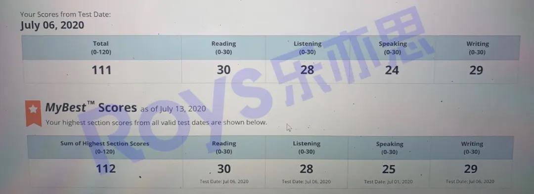 Roys樂亦思托福課程學員培訓12天進步12分拿下111