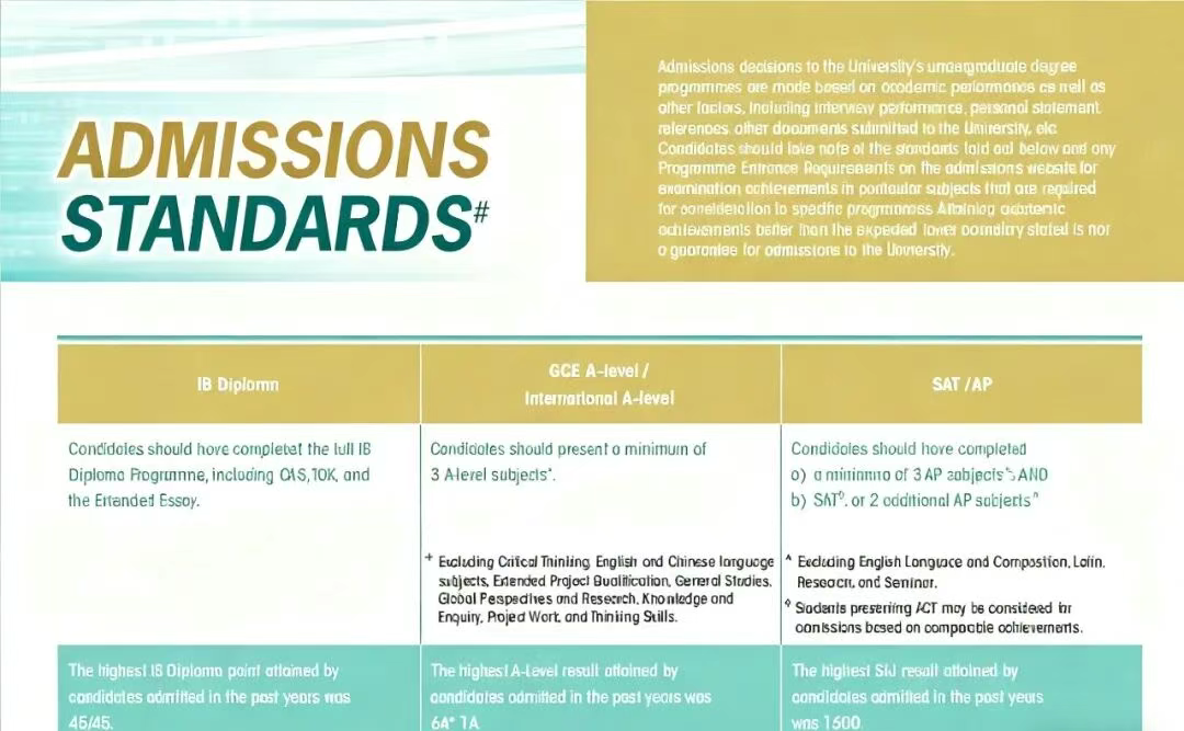 港大2026年Fall國際生的學術成績要求再次提升,堪稱“神仙打架”。IB成績要求在32-43分之間,A-level成績則要求三門達到3A-3A,四門達到3A1A-4A,AP成績要求3-5門達到3-5分,同時SAT成績需在1380-1560分之間。語言成績方面,雅思需達到6.5分,托福則需93分以上。更令人驚嘆的是,港大還公布了歷年來國際生提交的最優秀成績,其中A-level有人考出6A1A,IB滿分45分,SAT滿分1600分,競爭之激烈可見一斑。