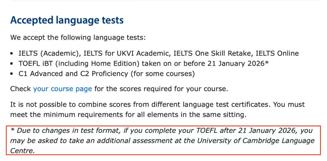 最新消息來啦!劍橋大學(xué)對2026年新托福的態(tài)度有了新變化,宣布“接受”啦!最近,劍橋大學(xué)研究生院更新了官網(wǎng)上的入學(xué)語言測試要求,補(bǔ)充了一條重要信息:2026年1月21日之后參加托福考試的同學(xué),除了提交新托福成績,可能還得參加劍橋大學(xué)語言中心的額外評(píng)估。